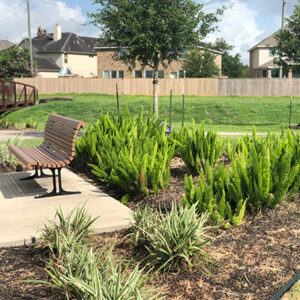Garden and seating amenities at the roundabout.