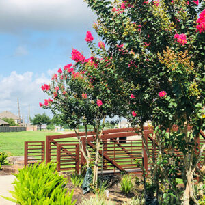 Blooming Crape Myrtle trees frame the rustic bridge.